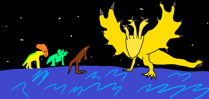 トリたちがブラックホールに吸い込まれてしまうと、中には帝王がいました。 帝王はキングギドラです! 帝王はトリたち草食恐竜の味方です。 #恐竜 #イラスト #小学生