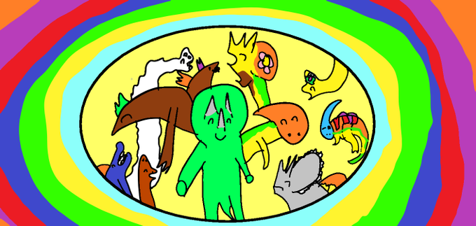 トテマキャラ、集合写真二作目ができました! みんなよろしくね! いるキャラは、トリ、テリ、マイッティー、雲キ、ブラキ店員、スピジー先生、パラサ将軍、メカトリ、ツノ子、ツメ男、プラ子です。 #恐竜 #イラスト #小学生