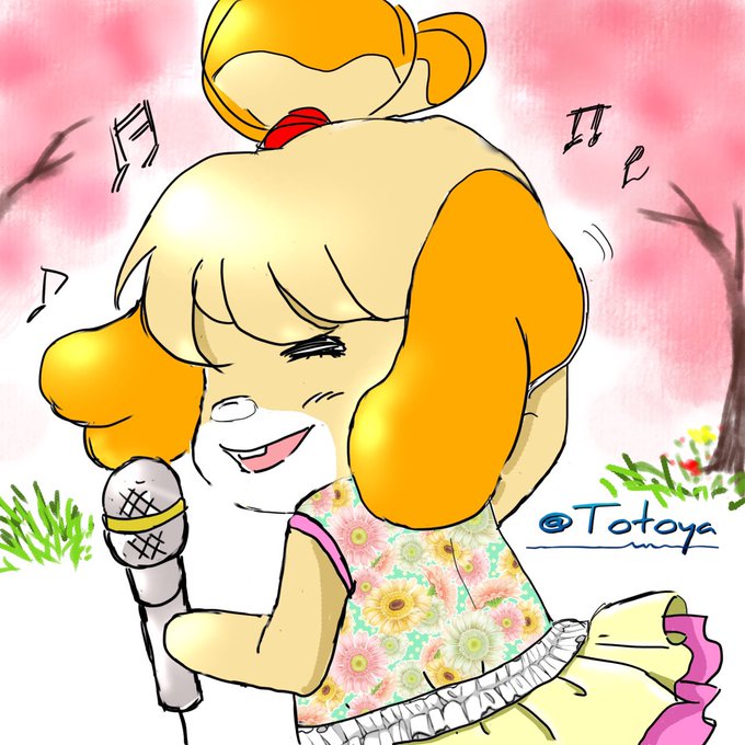 🌸こんにちわ🌸 あつ森の桜吹雪って今日まで? 桜吹雪の中の 島民それぞれのお花見スナップ♬ ①お花見会でマイク握り締めて『けけ演歌』を熱唱中のしずえさん🎤🌸 #どうぶつの森 #ACNH #デジタルお絵描き #しずえ