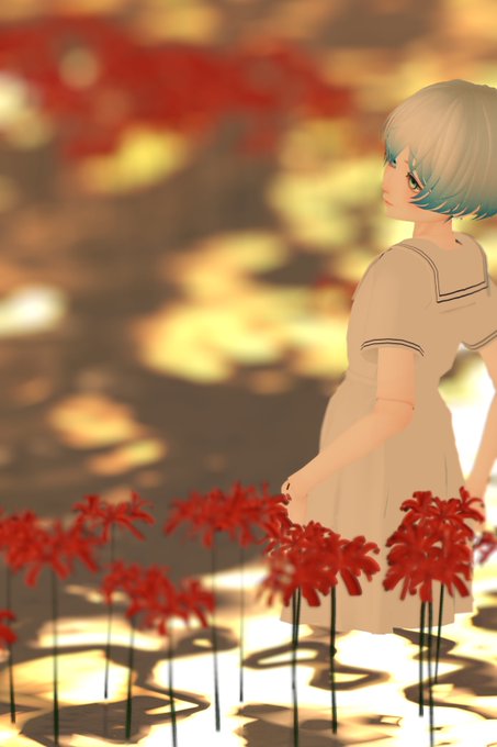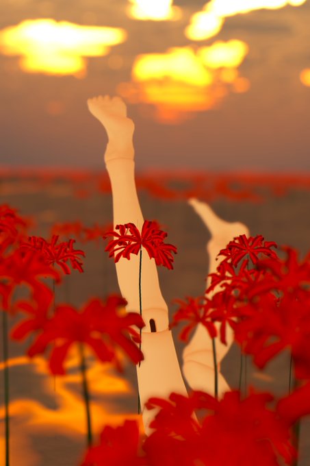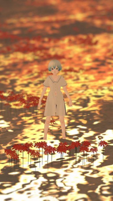彼岸花の覗く水面と空ばかりのworld。水面の反射が良い感じでポートレート撮影に良さそうです。ついスケキヨをやってしまいます。
