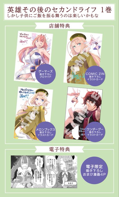 7月9日に漫画版『英雄その後のセカンドライフ』の1巻が発売になります!店舗特典としてゲーマーズ様、メロンブックス様、COMIC ZIN様、ワンダーグー様でご購入頂くとポストカードが、電子版特典としておまけ漫画が付きます!よろしくお願いしまーす!!