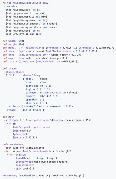 @jackrusher Is that a bitmap or vector renderer? If latter you could already do that w/ the SVG renderer of https://t.co/VZu6MINoFD. For that minimal look just use a simple "shader" function as in the STL mesh SVG examples here: https://t.co/dcNyMFuYFT