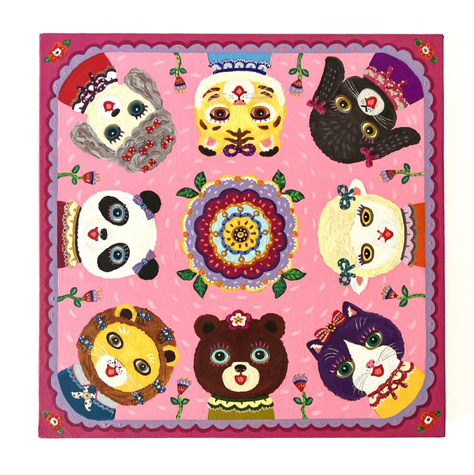 ハンカチの原画のアニマルフェイスズは海外の方の元へ✈️ 個人的にビビットカラーがきにいっているこちらのピンクちゃんはご覧いただけます🌸