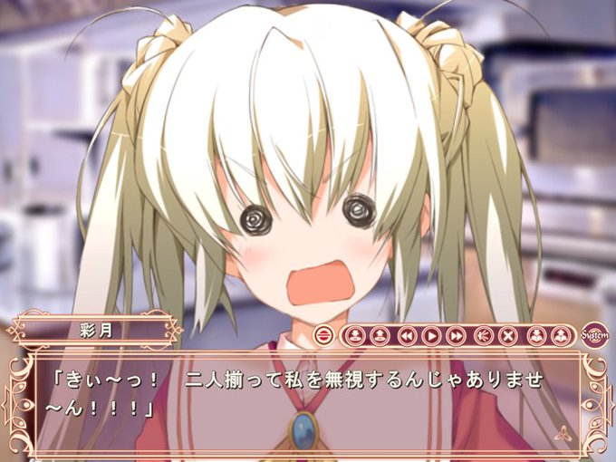 彩月√終了。 ツインテツンデレお嬢さま。 常に誇り高き子。大体は勢いで押し通す強さ…!普通の事にはポンコツ気味なとこ可愛い 親友とのぶつかり合い…後半は熱くてめちゃすき。 良きツンデレちゃんですた…