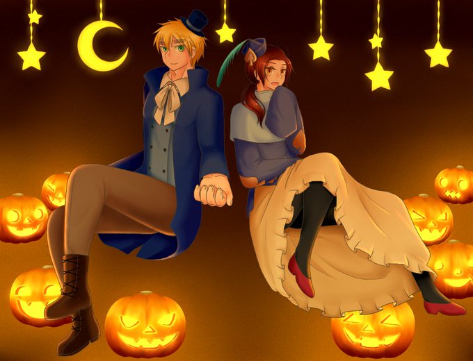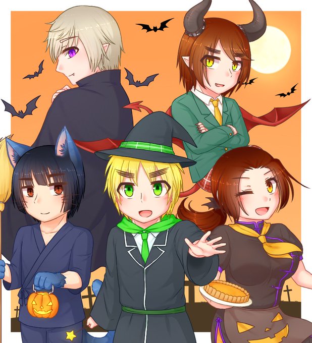 配役は🇯🇵→猫、🇬🇧→魔法使い、🇨🇳→料理人(ハロウィン仕様)、🇷🇺→ヴァンパイア、🇭🇰→小悪魔です