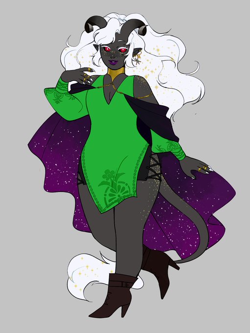 @PetitePasserine congrats!! i offer my tiefling lady, briar! she's a warlock with an elder star patron, and she's trying to save the world along with her two boyfriends. she's very much the heart of the relationship...