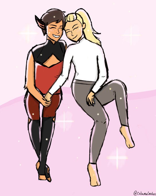 I recreated an adorably gay picture of @Gingerhazing and @MollyOstertag but they r smol lesbian feline and chaotic stronk blonde from #Shera uwu #catradora is too cute and I can’t get enough of these cuties🥺❤️✨