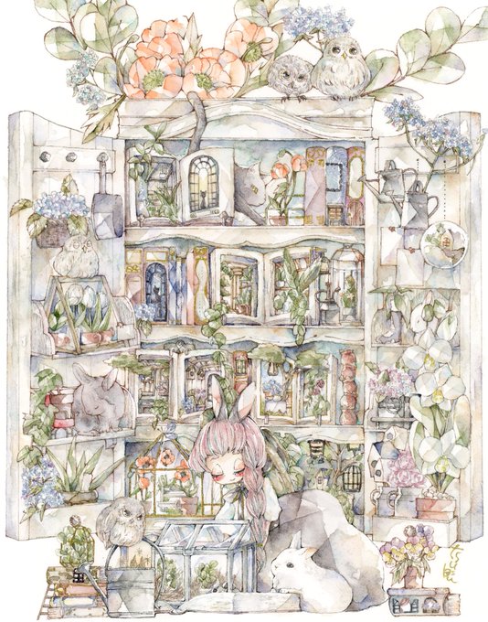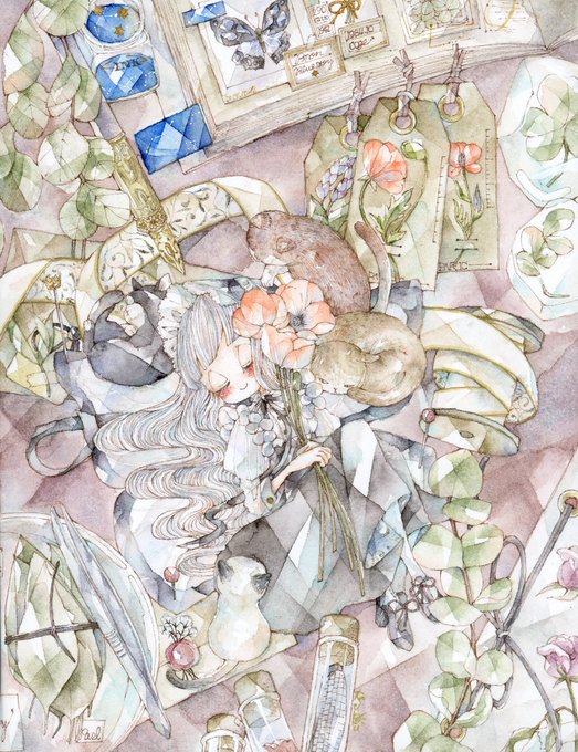 透明水彩使って、ちまちまと動物と女の子描いてます🐈
