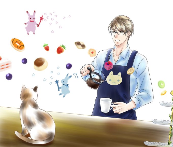 うさぎ妖精と猫のいる喫茶店。 おすすめはコーヒーとケーキのセットです。 #イラスト #イラスト練習