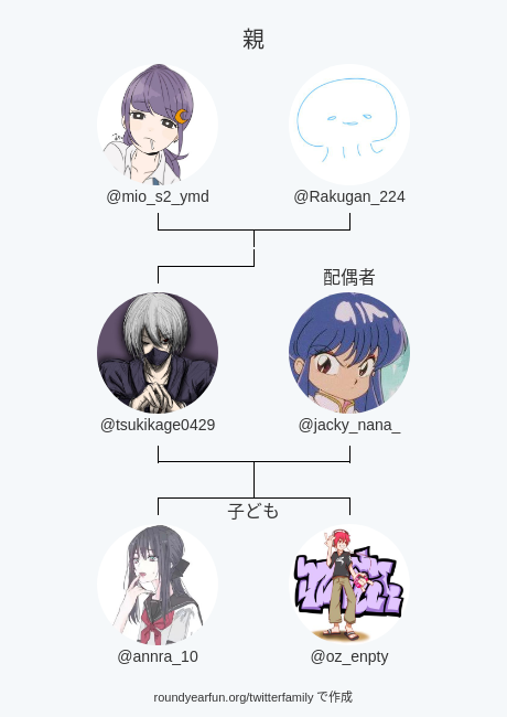 私のTwitter家族: 親: @mio_s2_ymd @Rakugan_224 配偶者: @jacky_nana_ 子ども: @annra_10 @oz_enpty via https://t.co/7d2X4AeGye ⠀