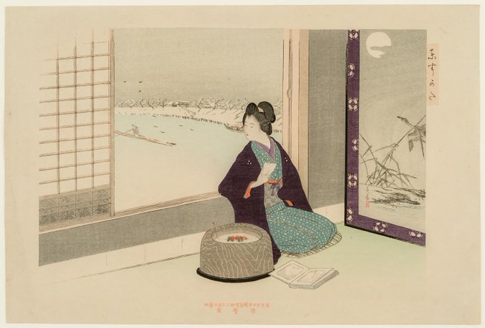 Woman Viewing Photograph Album on a Snowy Day, from the series (?) Eastern Figures (Azuma sugata)