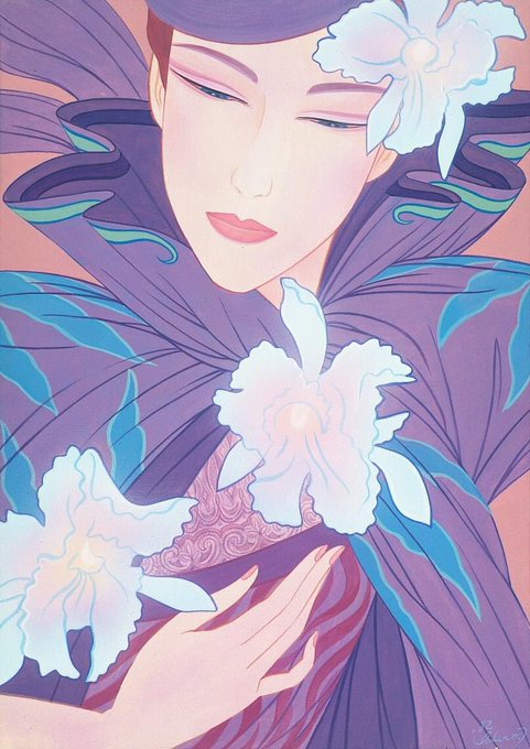 鶴田の得意とする赤と黒のコントラストが美しい作品です。視線には強い美しさがあり、見つめられるとそれに対してあらがえない気持ちになります。