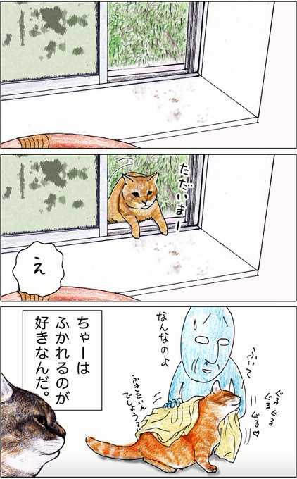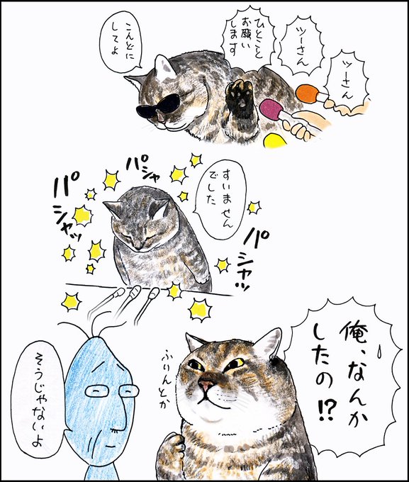 や、どうも、俺、つしま。さいきん毎日あめばっかりだったけど、レンキウは晴れてよかったね。「雨女のこのわしに出かける用事がないからや。感謝してもらいたい」って、おじいちゃんが。