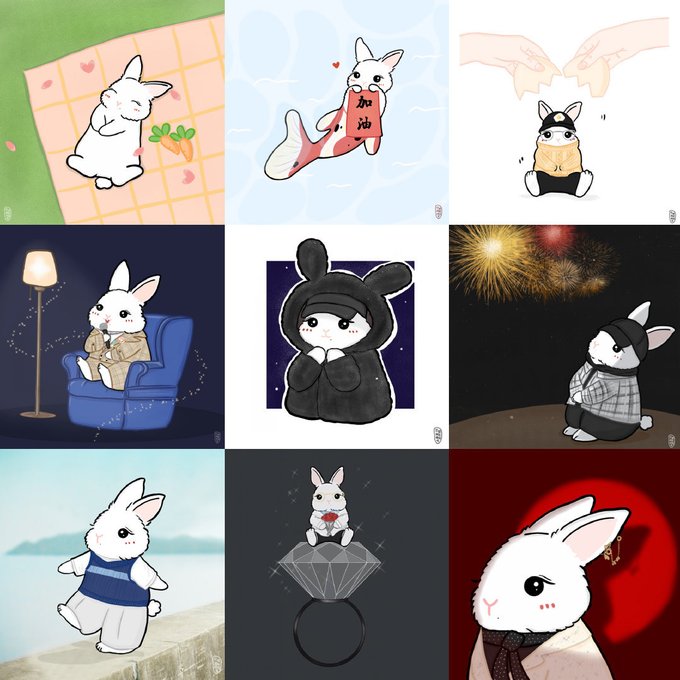 105마리 토끼 팬아트 모여모여🐇🐇 이렇게 같은 구도 다른 의상 입혀놓는게 너무 귀엽고 재밌다ㅋㅋㅋㅋㅋ cr.短腿猫猫喵喵喵 https://t.co/q4KNMTLbrN