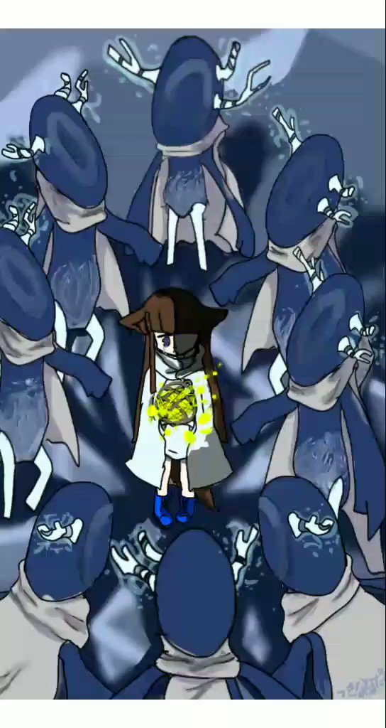 この絵実はほたるが着ている服が悲しみのエルダスと同じになっていて、もうすぐ自我は消滅し悲しみのエルダスになってしまうストーリーなのん。あとエルダスの灯火はいつもポーション使えなくするから『元気』を回復させないイメージなのん。悲しみに囚われて自分を失う的な..伝わると嬉しいのん🎀