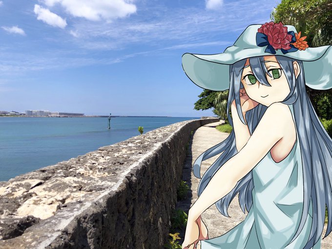 女の子が、海沿いの道を歩きながら振り返っている絵を描きました 写真にイラストを合成する試みに出ました。上手くいけば、推しを旅行させられるので……