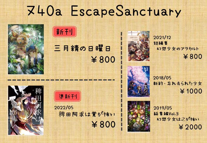 ね10ab「Escape Sanctuary」のお品書きです。秋の新刊「藤原妹紅は死が怖い・再炎」始め、小説本3点を持ち込みます。