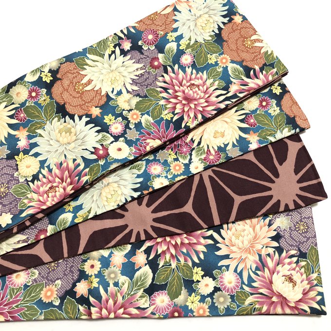 九十九堂の半幅帯(細帯)は結ばない帯結びにも使えます。リバーシブル仕様なので両面見せられてアレンジ色々出来ますよ。