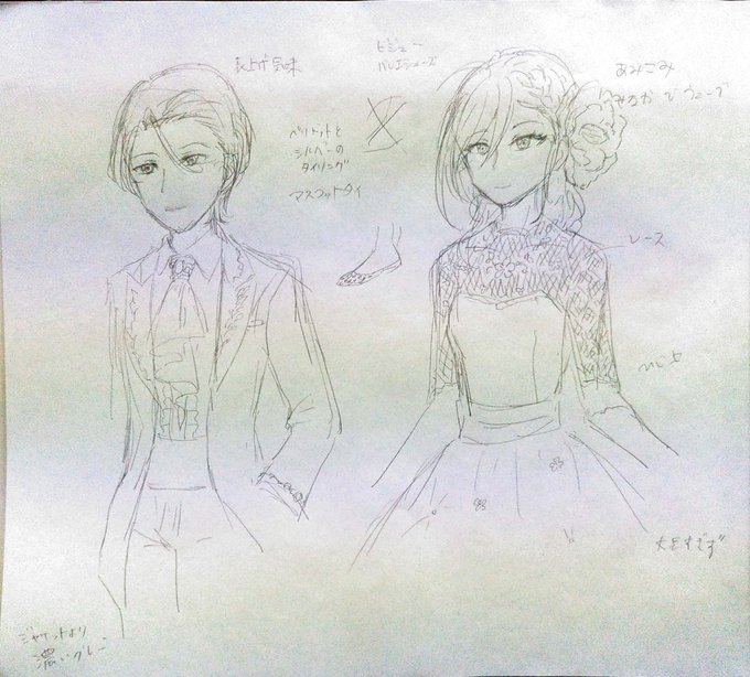 マジデ合宿行ったときに描いたものを今更上げてみる。1枚目は二人の共通ステージ衣装って星祭りしかないんだな〜と考えながら。2-3はツバキさんにフレンチカンカンしてほしいやつ。黒ストッキング露出は自重した。4は戀さんのご本のドレスアップの二人イメージ描かせていただいた。