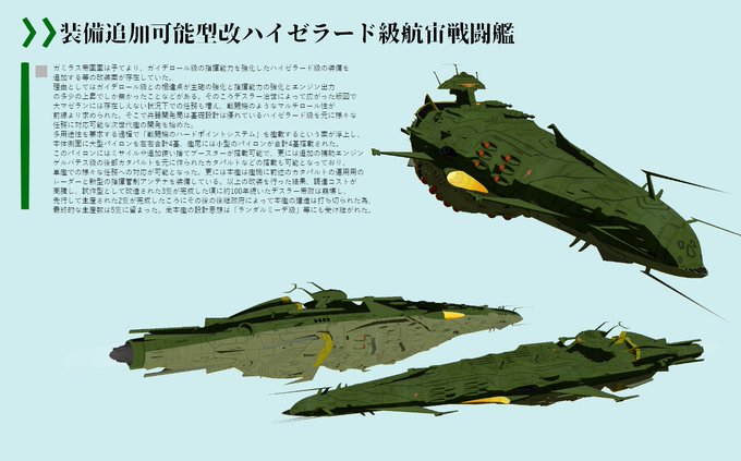 デスラー帝政末期、ガイデロール級の指揮能力を強化したハイゼラード級の装備を追加する等の改装案が存在していた。 理由としてはガイデロール級との相違点が主砲の強化と指揮能力の強化とエンジン出力の多少の上昇でしか無かったからです。 ぶっちゃけそのままハイゼラードを作るメリットがなかった。