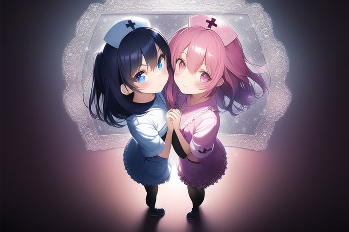 2girlsで生成してた コスプレナースさんも グループガールズにタグ変えたら 元々のハロウィンコスプレナース服のハロウィン要素が復活した?_(:3 」∠)_