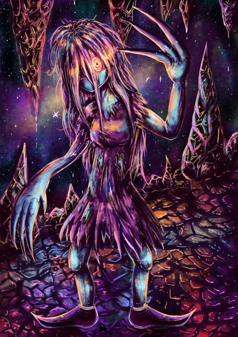 I was ask to draw this villain character with blue skin, pink hair and holes on the dress!