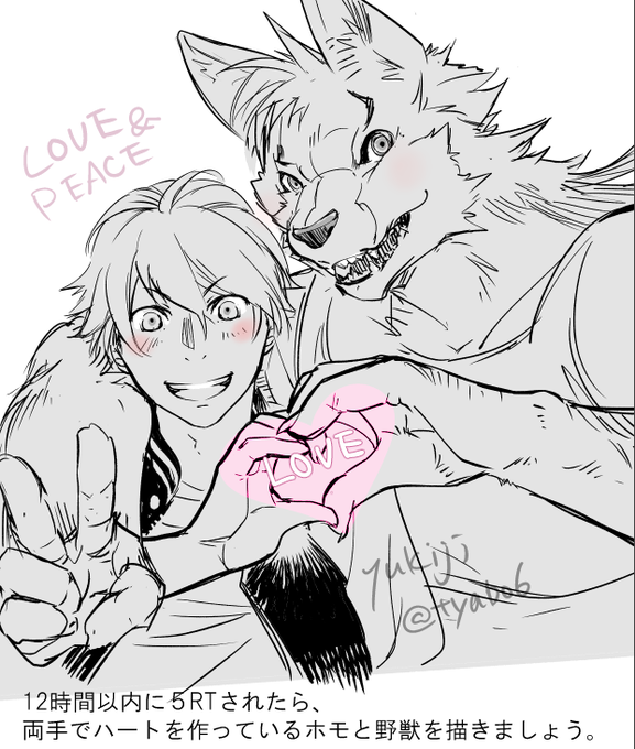 お題:12時間以内に5RTされたら、両手でハートを作っているホモと野獣を描きましょう。 RTありがとうございまっす♡
