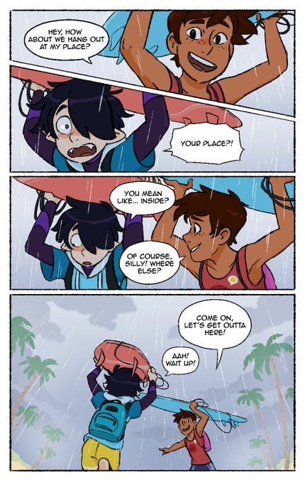 apparently it's #webcomicday! My comic SPF 100+ is about a vampire boy who learns how to surf despite his aversion to the sun because he's crushing hard on a local surf boy 🏄🏻♂️🏄🏾♂️