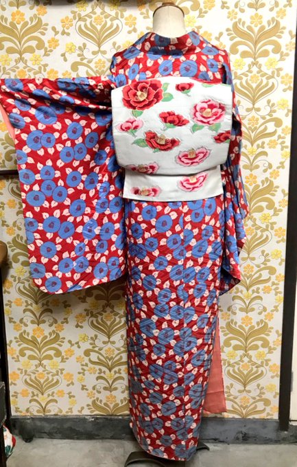 #今日のトルソーさん は夢二みたいなまん丸椿柄のお着物に椿の洒落袋帯を合わせました。