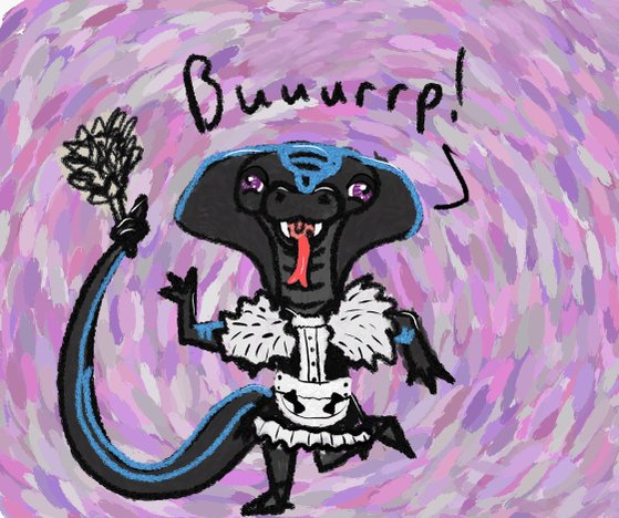 @koboldwife Here's Ruheg, a large, peaceful slab of Gaboon viper that likes easy laughs and fish frens. Also, crossing their arms lol