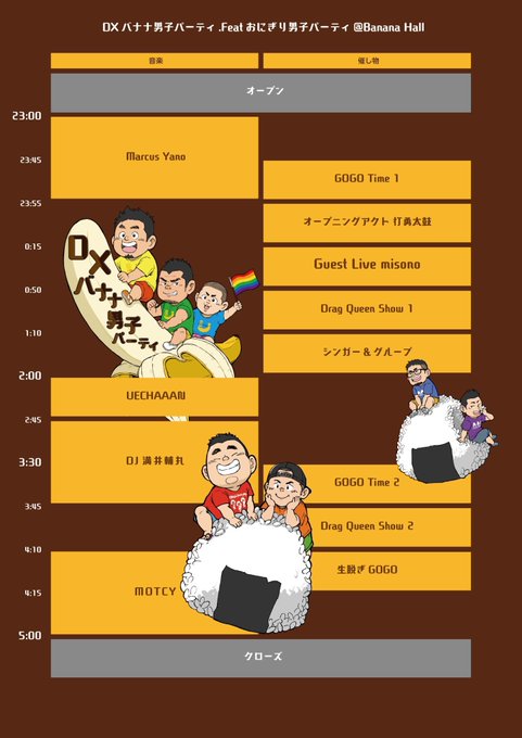 10/12開催のDXバナナ男子パーティ feat.おにぎり男子パーティ、キャストフライヤー解禁されました👏