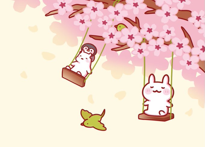 桜ブランコ🌸🔆 #イラスト #オリジナル #オリジナルイラスト #うさぎ #ペンギン #しろくま