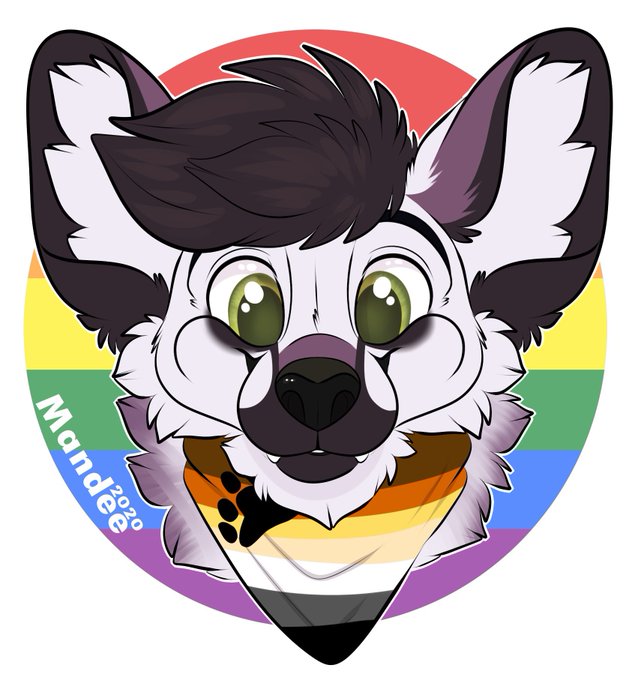@The_Lion_Thing I’d like one please! For the flag in his hand, I’d like it to be the pansexual flag, for the flag in the background, please use the rainbow flag, and for the accessory, if you could give him the bandanna with the gay bear flag that you gave him before, that would be great.