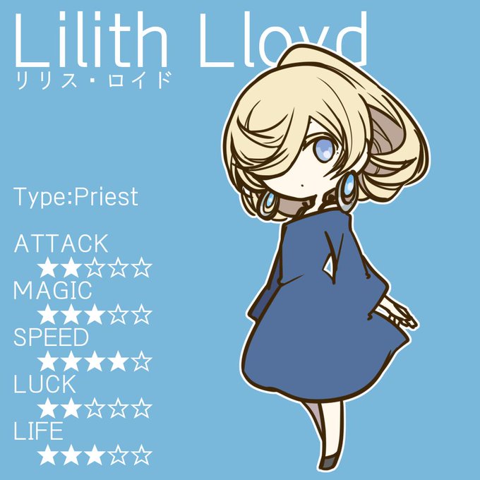 リリス//教会マップ所属。彼女の依頼を達成する・同行を重ねることでイベントが発生し、完遂することで同行者から味方へと種別が変更になる。味方全体への能力値強化・デバフ解除の支援を得意としているが、燃費が悪く運用は難し目。物理攻撃が弱く、当人もひ弱なため後衛向き。