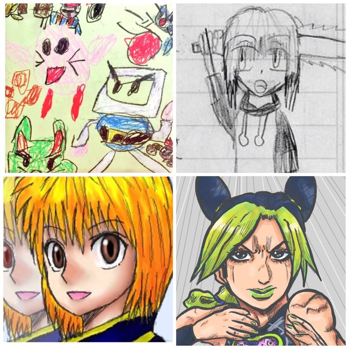 #絵の変化 左上:幼稚園 右上:小6 左下:中3くらい 右下:今 根本は変わってない気がする