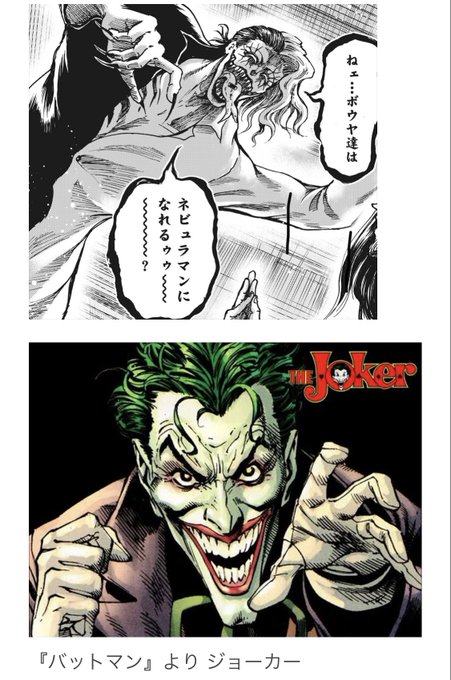 #忍者と極道 何度も言うけど、 歪罹井さんってハーレイ・クインがモチーフだよね? ツートーンな衣装にメイク、髪の垂らし方も似てるし。 孔富先生も、かなりジョーカー入ってるよなぁ。