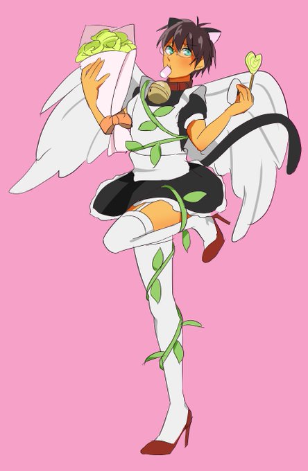 #裸の推しにフォロワーさんから言われたものを足してく 鈴付き首輪 メイド服 天使の羽 なっちゃんのメガネ 巻き付く草 おにぎり すあま ネコミミとしっぽ ガーターベルト ピンヒール 花(束にしちゃった) 飴 です!!