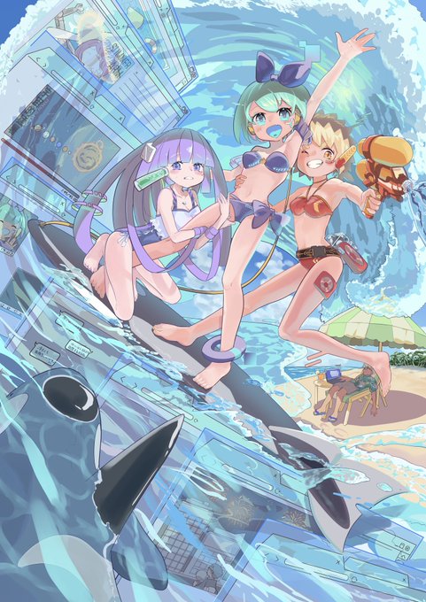 #夏が終わりそうだし今年描いた水着絵を貼ろう 今年はうちの子3人組の水着でした☺️