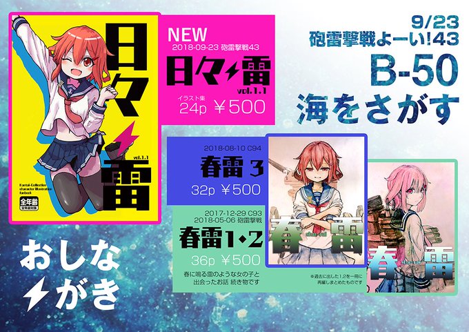 23日(日)の砲雷撃戦に出ます。 新刊は雷イラストまとめ本です。一言あとがきみたいな付属ペーパーをつくりたい、ネットに上げてない絵も収録してます。 既刊もすこしあります、印刷所を変えた都合で春雷1と2が一冊になりました。内容は変わりありません。 よろしくお願いいたします。