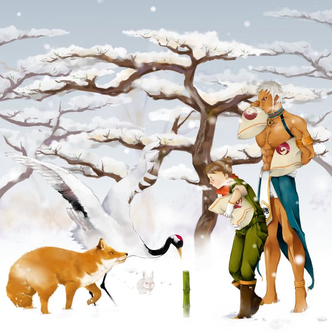 新年早々ハリちゃん抱えて走ってるのは、以前描いた花札シリーズに出てきたスカラベさん。 ハリちゃんのいらん好奇心にいつも付き合ってくれる脳筋兄さん。