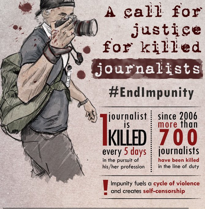 On average, 1 journalist dies every 5 days in the pursuit of his/her profession #EndImpunity https://t.co/tyLFaw1G0r