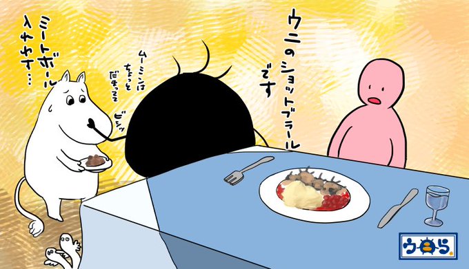 ウニらリターンズ世界のウニら編⑧スウェーデン編。家庭料理でソウルフードのショットブラールはミートボール料理なんですがウニらはウニで作っちゃったみたいね。北欧繋がりでムーミンも来てくれたけどなんか大雑把ですなw #ウニら #イラスト #ゆるいイラスト #オリキャラ #ショットブラール #北欧