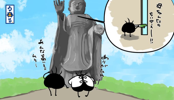 婆ちゃんと小旅行編16茨城県牛木市の大仏にウニら一家が来ましたよう。でも母ちゃんと婆ちゃんは高いのは無理なんで男子たちで登ったんだけどここはびっくりするぐらいサイバー空間でコブラかよって位に未来感あるんすよ #ウニら #ゆるいイラスト #オリキャラ #イラスト #茨城県 #牛木市 #大仏