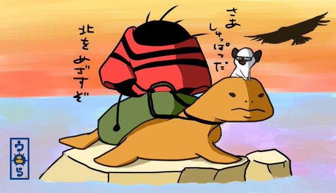 ウニらリターンズ名作っぽい②けれどウニら、お前は来たんだアンデスに続くこの道を。さぁ出発だ、今、陽が登る、亀に結んだ手綱を掴み、ポンチョに夜明けの風はらませて、母さんのいるあの空の下遥かな北を目指せ♪ #ウニら #イラスト #ゆるいイラスト #オリキャラ #母を訪ねて3000里