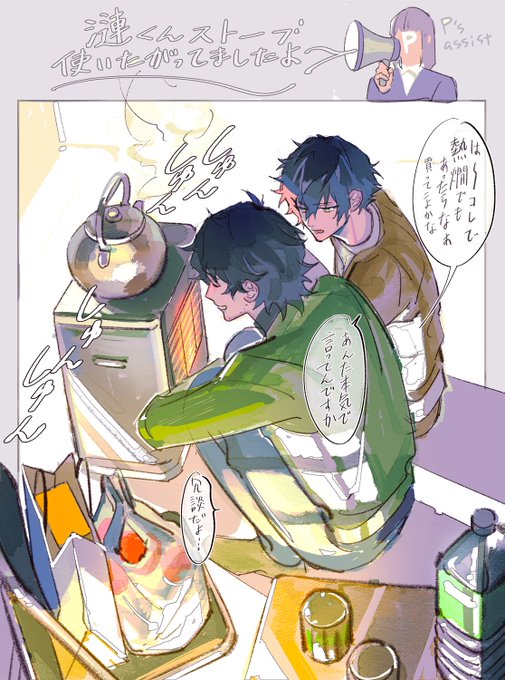 ジュンくん冬ボイス「佐賀美陣がストーブの前を陣取ってて部屋が寒いんすよね。……ちょっと蹴ってきていいですか?」の漫画です(ジュン陣)