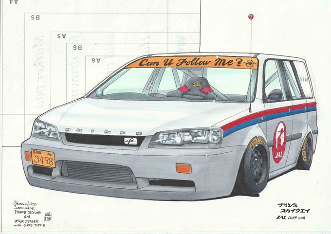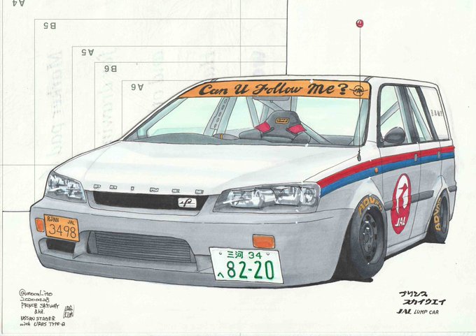 ステージアに34顔面でURAS Type-Qエアロ。黒箱№102のトミカリスペクトでこのカラーリング。公道ナンバーはレイヤー化(物理)(紙製)で有り無しできる。あ、フォローミーカーじゃないけどCan U Follow Me?