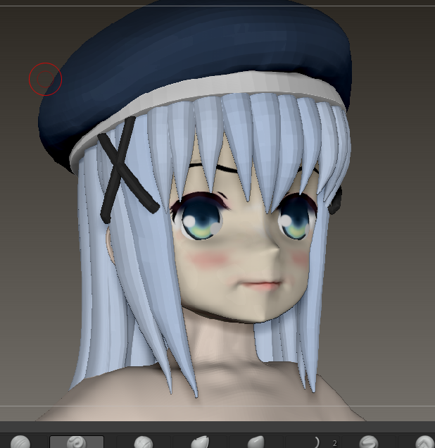 #ZBrush キャラクター変更中・・・ 斜角 で 髪のかどがとがるので このあたりを まるめて削る 作業が続くの
