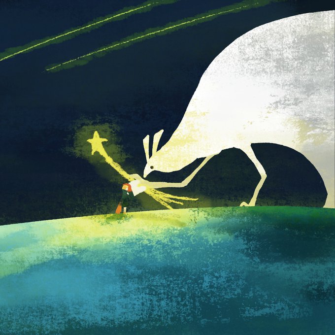 あのはしごを登ると 穏やかな場所が待っている 最初はちょっと暗いけどね ふたりの大きないきものが 見守っているから 怖がらないでのぼっておいで #絵本 #kidlit #児童書