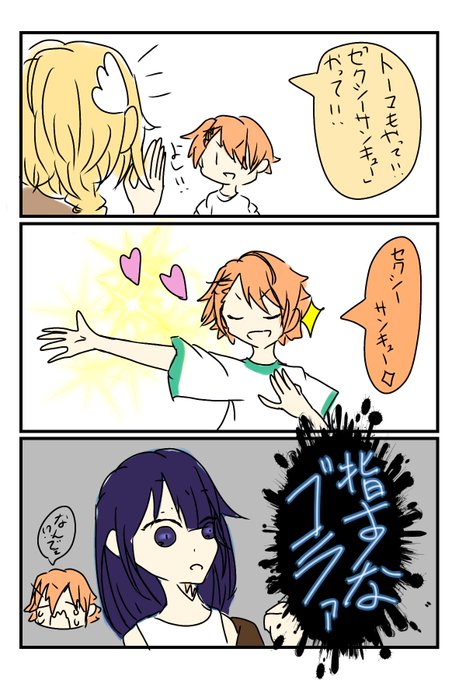 劇団組で「セクシーサンキュー!」 吹き出しで隠れてますがジュノちゃんは🖕しちゃってます トーマis不憫、ついでにコウセイも不憫 雑注意! #うちの子 #Nekoハウス #オリキャラ #不憫 #セクシーサンキュー