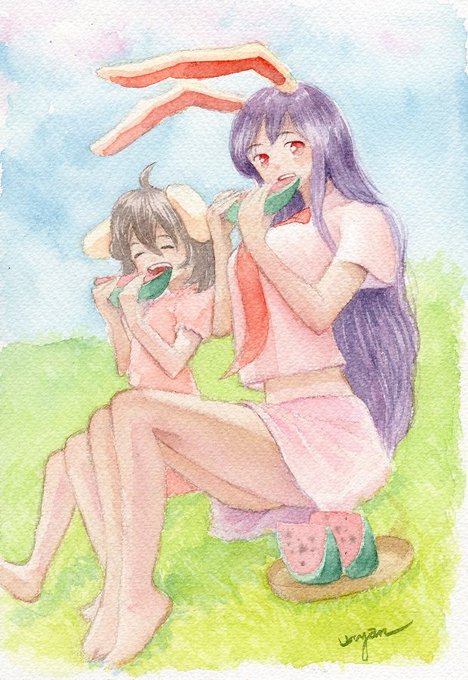 毎月17日と18日はイナバの日ということで、スイカを食べてるうどんげとてゐを描いてみました(*'▽')